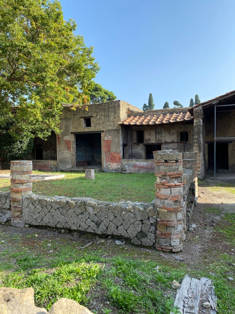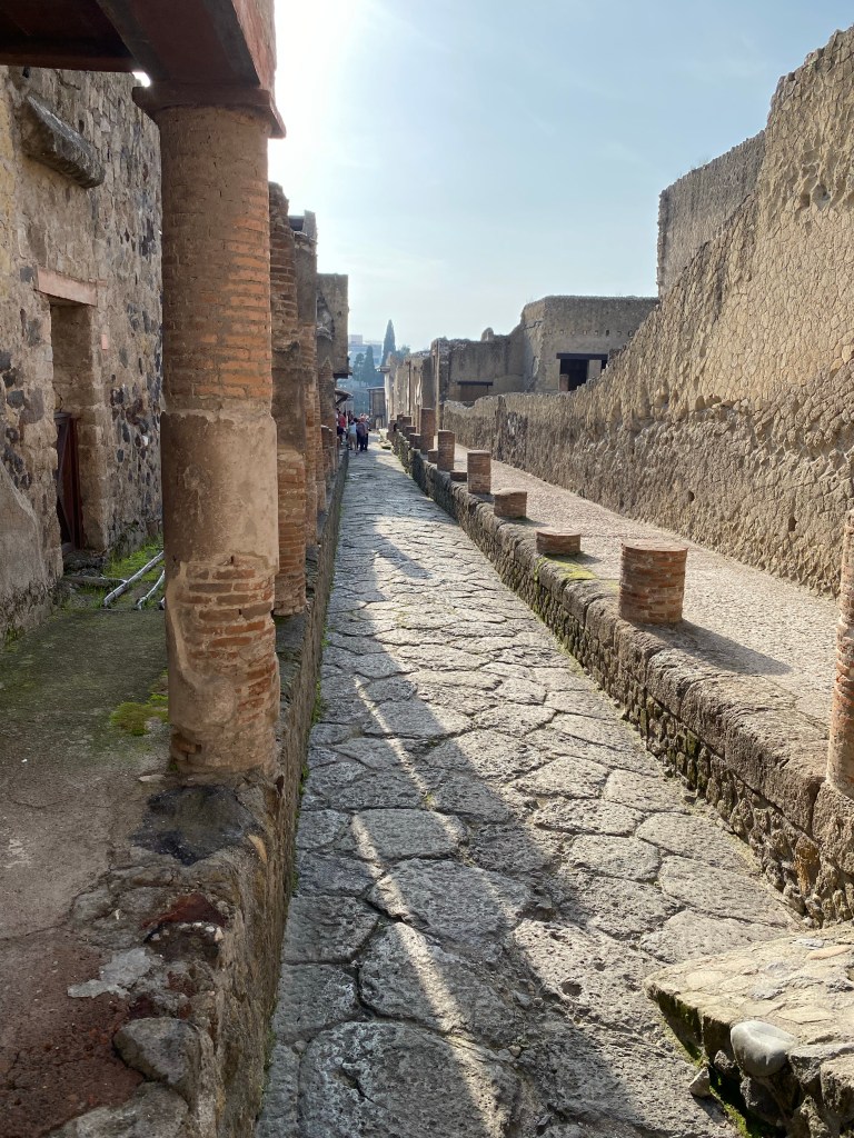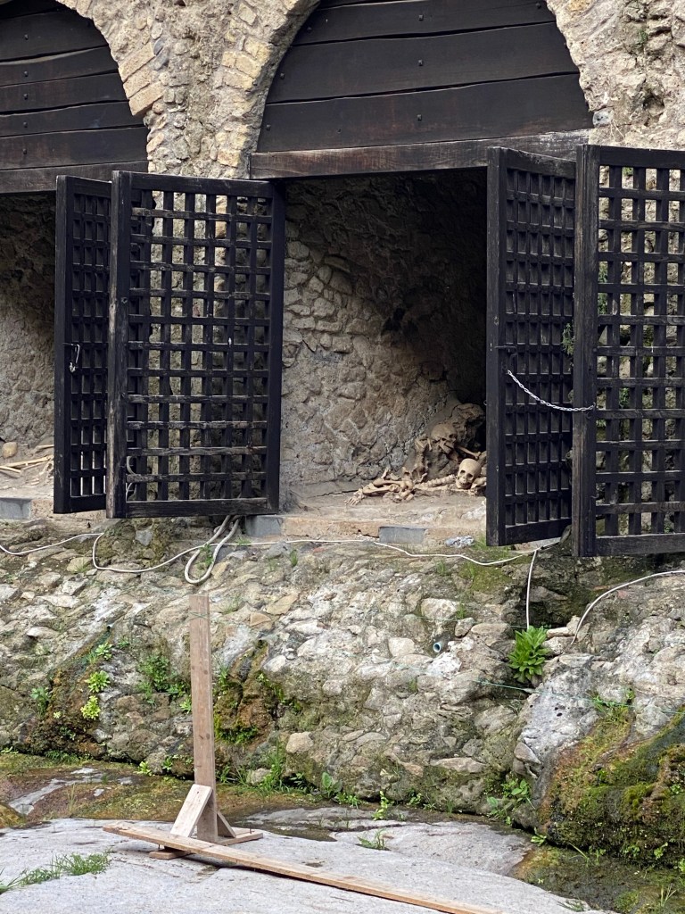 The area exposed is only about a quarter of the original town. it is believed that many more buildings are still buried. The restoration here is much harder than at Pompeii. At Pompeii they could wash the ash away exposing buildings etc. Here they have to use various tools including hammers and chisels. Because unlike Pompeii Herculaneum was a mixture of mud and ash, becoming solid within the buildings. An outside cook house operating as a sort of street cafe. Painted murals still very vivid. Behind the glass is the original wooden sliding door. The statue was not an original statue, but a gift from a local politician. Within the rows of arches where many recovered skeletons were discovered. Heading through the tunnel, back up from sea level to current town level.