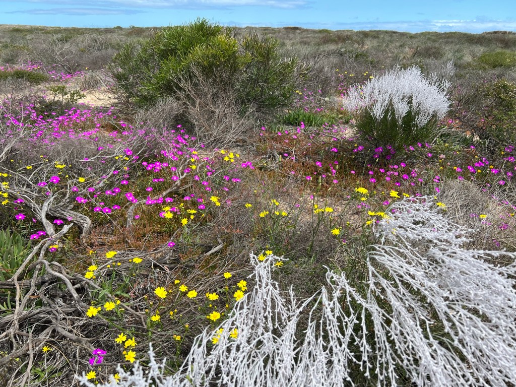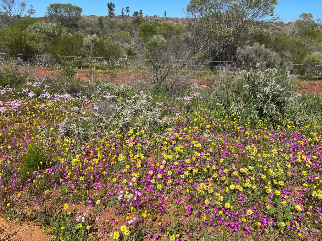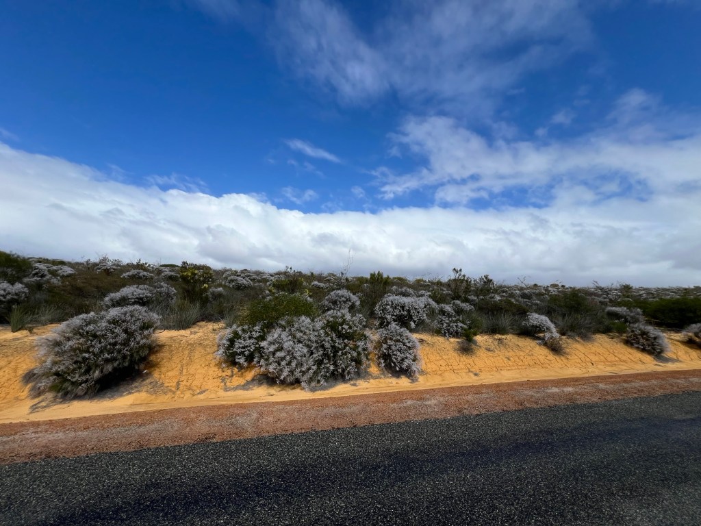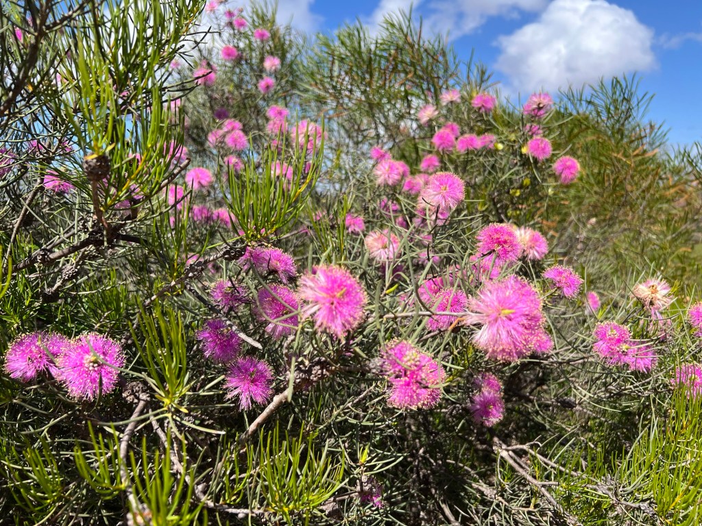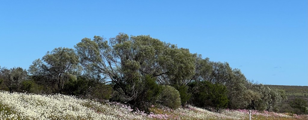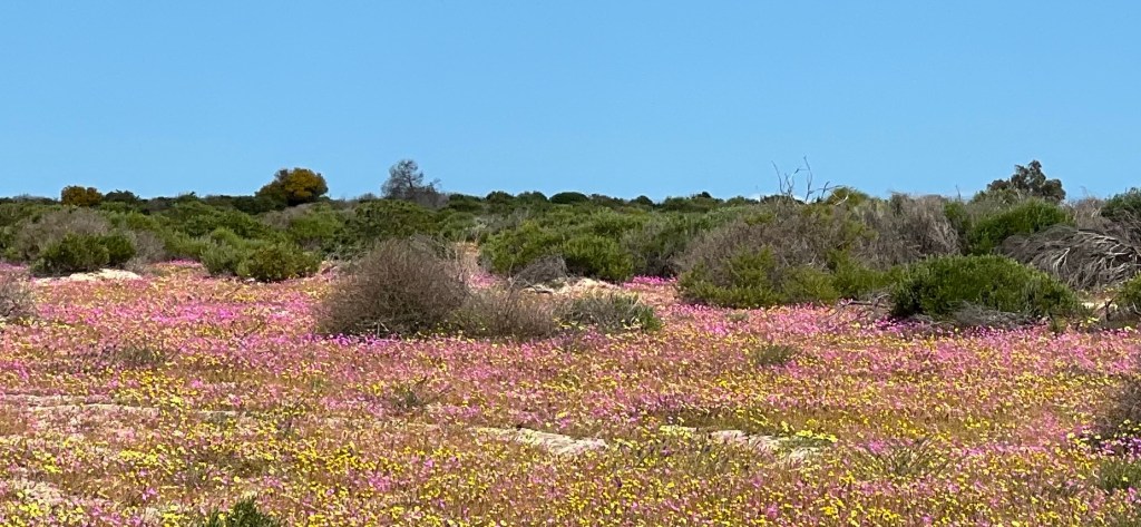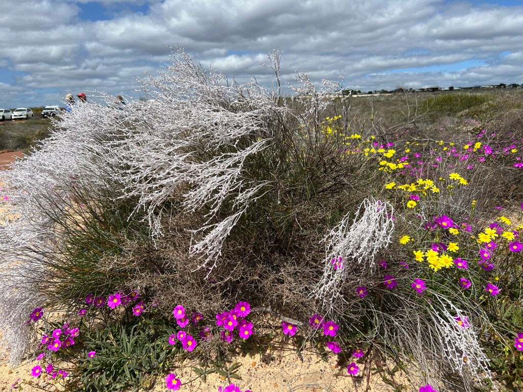 Took off for a 6 day drive from home (WAIKIKI WA) to Kalbarri stopping off at Cevanties for 1 night then on to Jurien Bay, Lesueur National Park, Eneabba, Three Springs, Mingenew, Coalseam Conservation Park, Mullewa to Geraldton. Stayed one night there. Next day we drove to Kalbarri for 3 nights, travelling up the coast road. We had intended returning to Geraldton on the Saturday but decided to drive home from Kalbarri, a 7 and1/2 hour drive. Many of the wildflower pictures were taken during our driving from place to place.